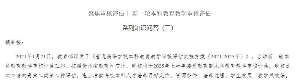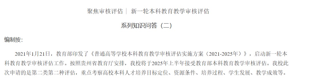 聚焦审核评估 | 新一轮本科教育教学审核评估系列知识问答(二)编制按:2021年1月21日,教育部印发了《普通高等学校本科教育教学审核评估实施方案(2021-2025年)》,启动新一轮本科教育教学审核评估工作。按照贵州省教育厅安排,我校将于2025年上半年接受教育部本科教育教学审核评估。我校此次申请的是第二类第二种评估…