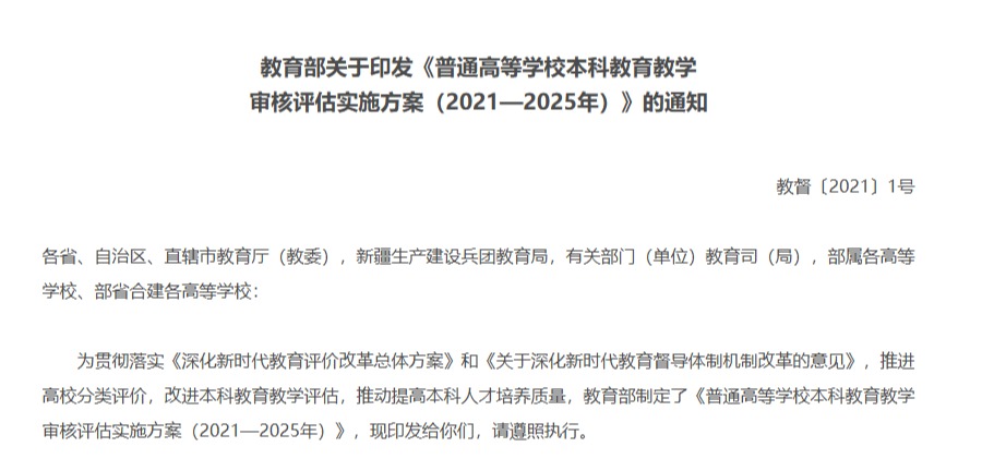 信息名称:教育部关于印发《普通高等学校本科教育教学审核评估实施方案(2021—2025年)》的通知信息索引:360A11-07-2021-0002-1生成日期:2021-02-03发文机构:中华人民共和国教育部发文字号:教督〔2021〕1号信息类别:高等教育内容概述:教育部印发《普通高等学校本科教育教学审核评估实施方案(2021—2025年)》。教…