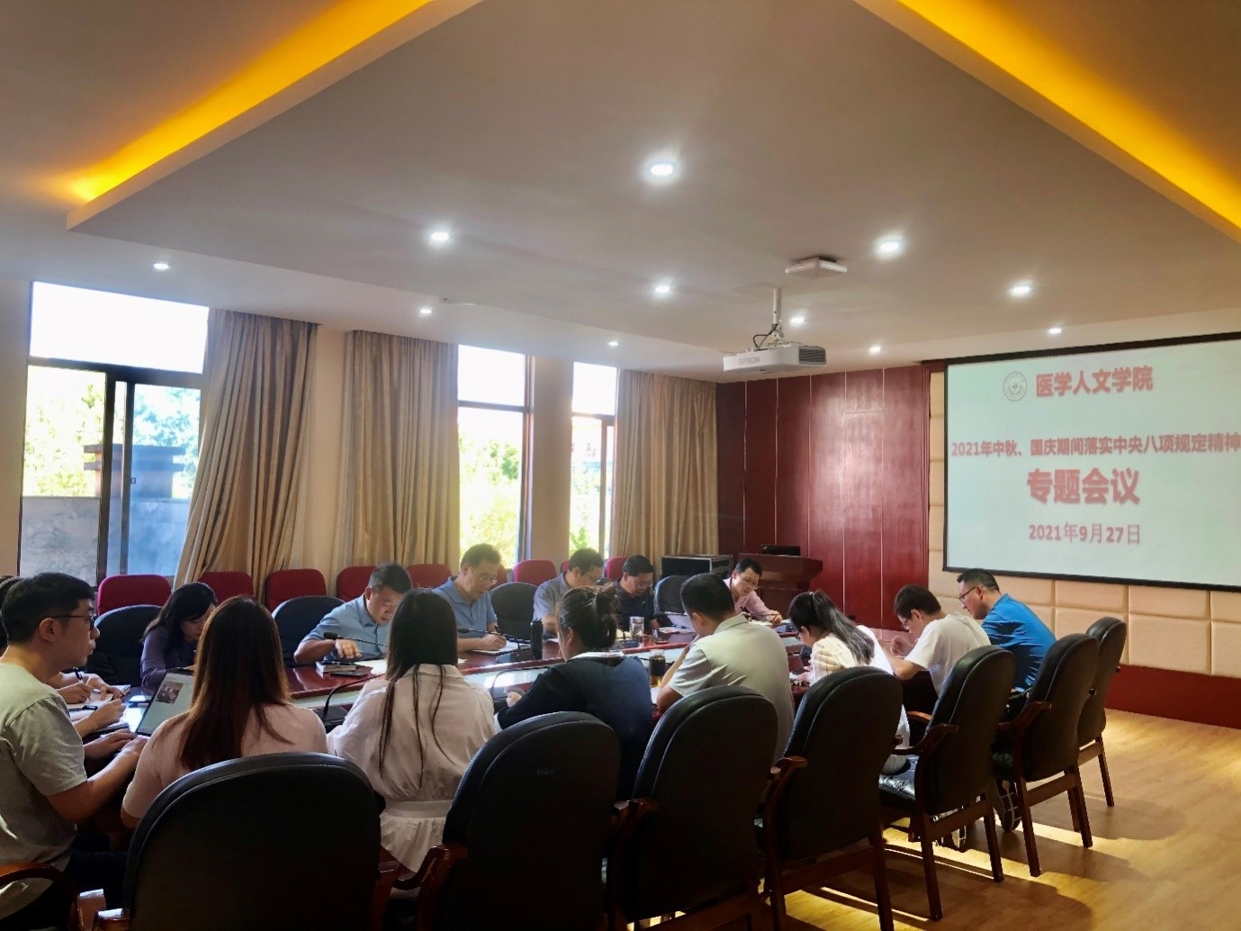 2021年9月27日上午,成人影院 召开关于2021年中秋国庆期间落实好中央八项规定精神专题会议。学院党政领导班子、各科室、各教研室负责人参加会议;会议由党委副书记张健主持。会议传达了中央八项规定精神的文件内容,着重从三个方面对全院党员干部提出了要求:一是要履行主体责任,切实增强廉洁自律意识;二是要严明党…