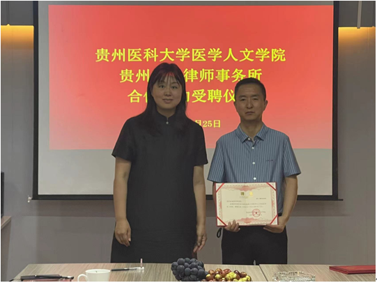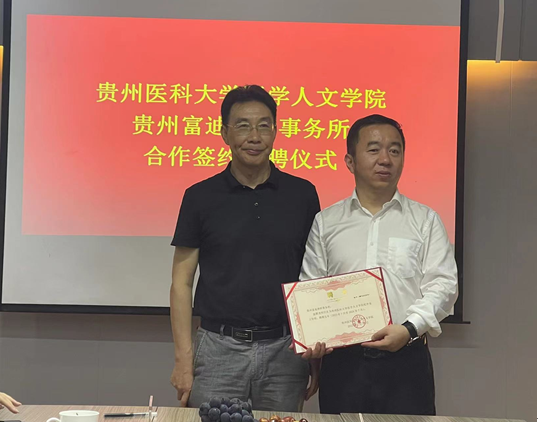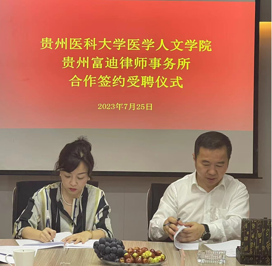 副院长彭丹及相关工作人员一行赴贵州富迪律师事务所举行全面合作签约及实践教学基地授牌仪式。第七届贵州省律师协会理事会副会长、贵州富迪律师事务所主任归东,贵州富迪律师事务所副主任张柱都及有关律师职员参加仪式。会议活动由归东主持。