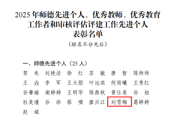 学院2025年师德先进个人、优秀教师、优秀教育工作者和审核评估评建工作先进个人表彰名单