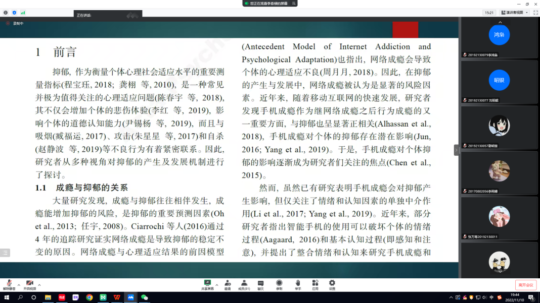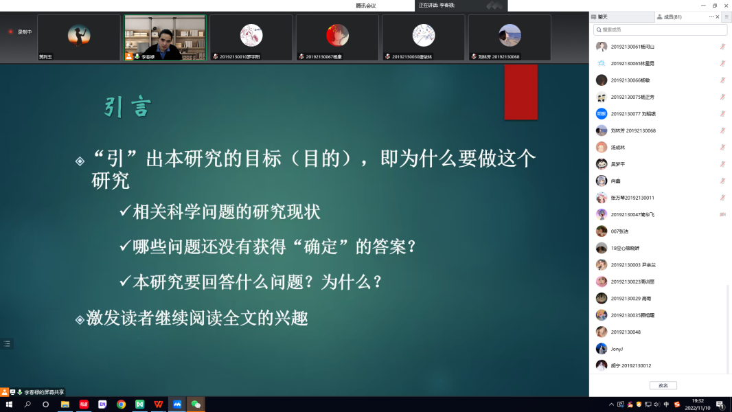通过线上会议的形式,开展了本科生毕业论文写作指导培训,特邀了李春禄博士对2023届应用心理学专业学生进行毕业论文写作指导。培训中,李春禄首先从已有核心期刊发表的论文出发,对论文各个部分进行深入解读,向同学们讲解了心理学论文应遵守的写作规范和主要结构。同时,李春禄强调,科学研究论文的基本概念就是报告对某一科学问题进行研究的发现,这是表达对该科学问题的观点最为直接的方式。其次,李春禄还针对性地讲解了“文章标题的重要性”、“引言部分如何写作”以及“开题报告的内容格式”等重要内容。