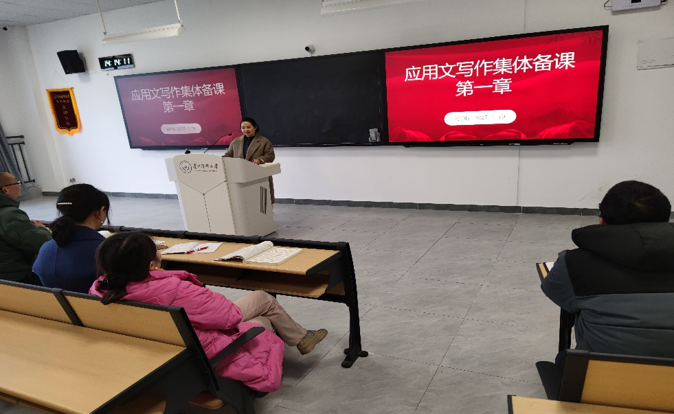 总结上学年教育教学经验,在以往教案、课件的基础上,教研室教师集中探讨了本学期各门课程的教学内容安排、教学方法、课堂互动形式设置等,老师们将自己在上学期教学实践中的一些新的教学设计和教学方法共享共研,经过研讨,补充修订了《中国传统文学文化》、《大学语文》和《应用文写作》三门课程前4周授课的集体备课教案、课件。