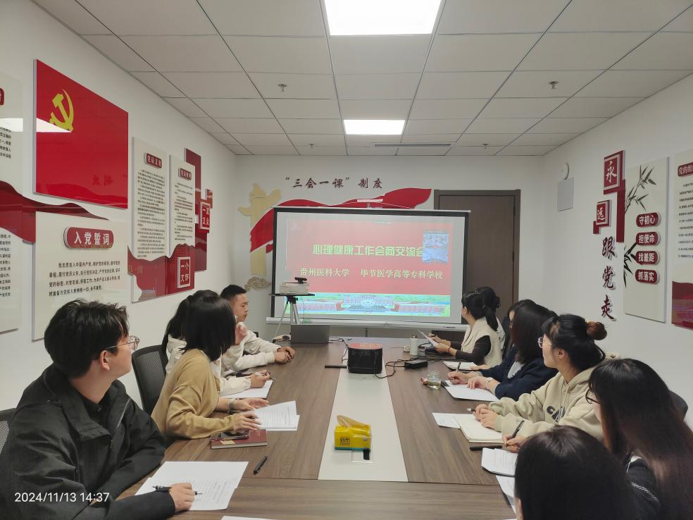 为促进校际对口帮扶心理健康工作的有效落实,实现交流及优质资源分享,2024年11月13日14:30,由成人影院 教工第三党支部(成人影院 心理发展指导中心)牵头组织,我校与毕节医学高等专科学校(以下简称“毕节医专”)通过线上会议,就心理健康相关工作进行了交流。毕节医专党委委员、副校长叶茂,学生处学生管理科…