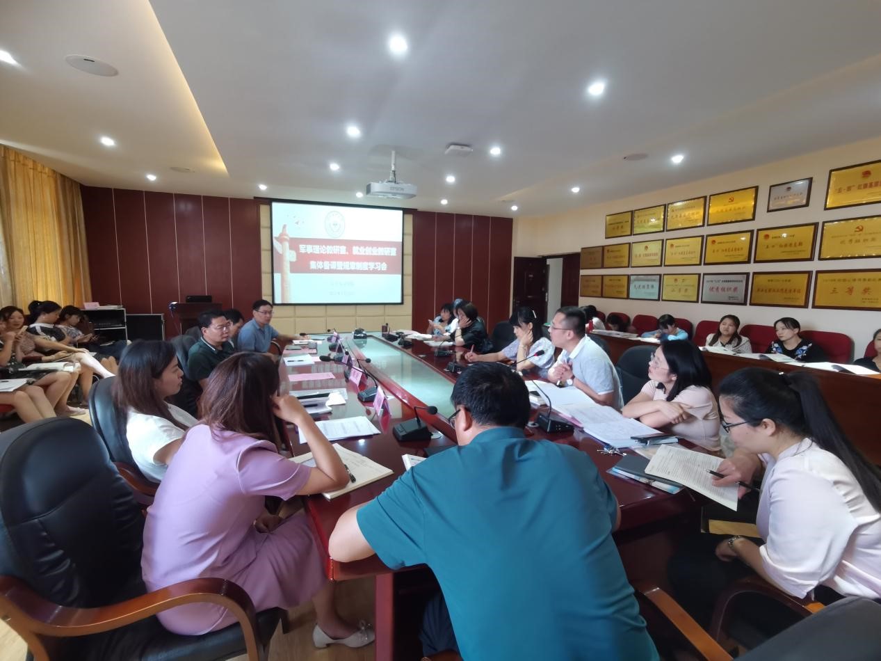2021年9月10日,军事理论教研室在善思楼4楼会议室召开集体备课暨规章制度学习会议。成人影院 院长杜凯、副院长严万森、军事理论教研室全体教师参加会议,会议由军事理论教研室负责人杨明主持。会上,严万森副院长领学了《关于教师管理若干规定》《关于教师规范撰写教案的规定》《集体备课制度》《军事理论教研室教学突…