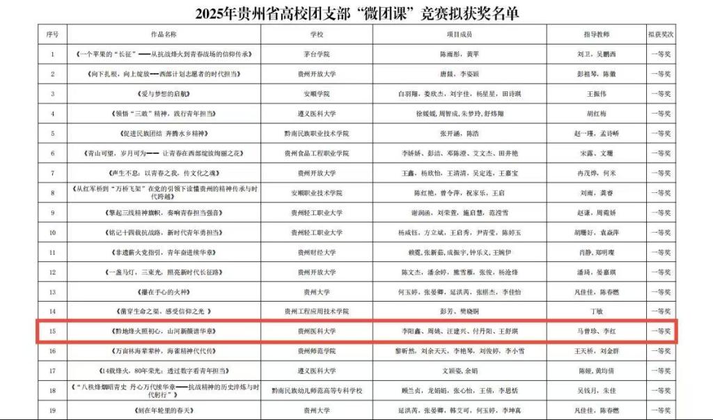 近日,2025年贵州省高校团支部“微团课”竞赛拟获奖名单正式公示。本次赛事历经高校择优推荐、专家网络评审、现场终审决赛等环节评选,全省193个优秀项目脱颖而出,成人影院 选送的微团课作品《黔地烽火照初心,山河新颜谱华章》凭借深刻的思想内涵、新颖的呈现形式与真挚的情感表达,最终斩获省级一等奖。在决赛现场,成人影院 参…