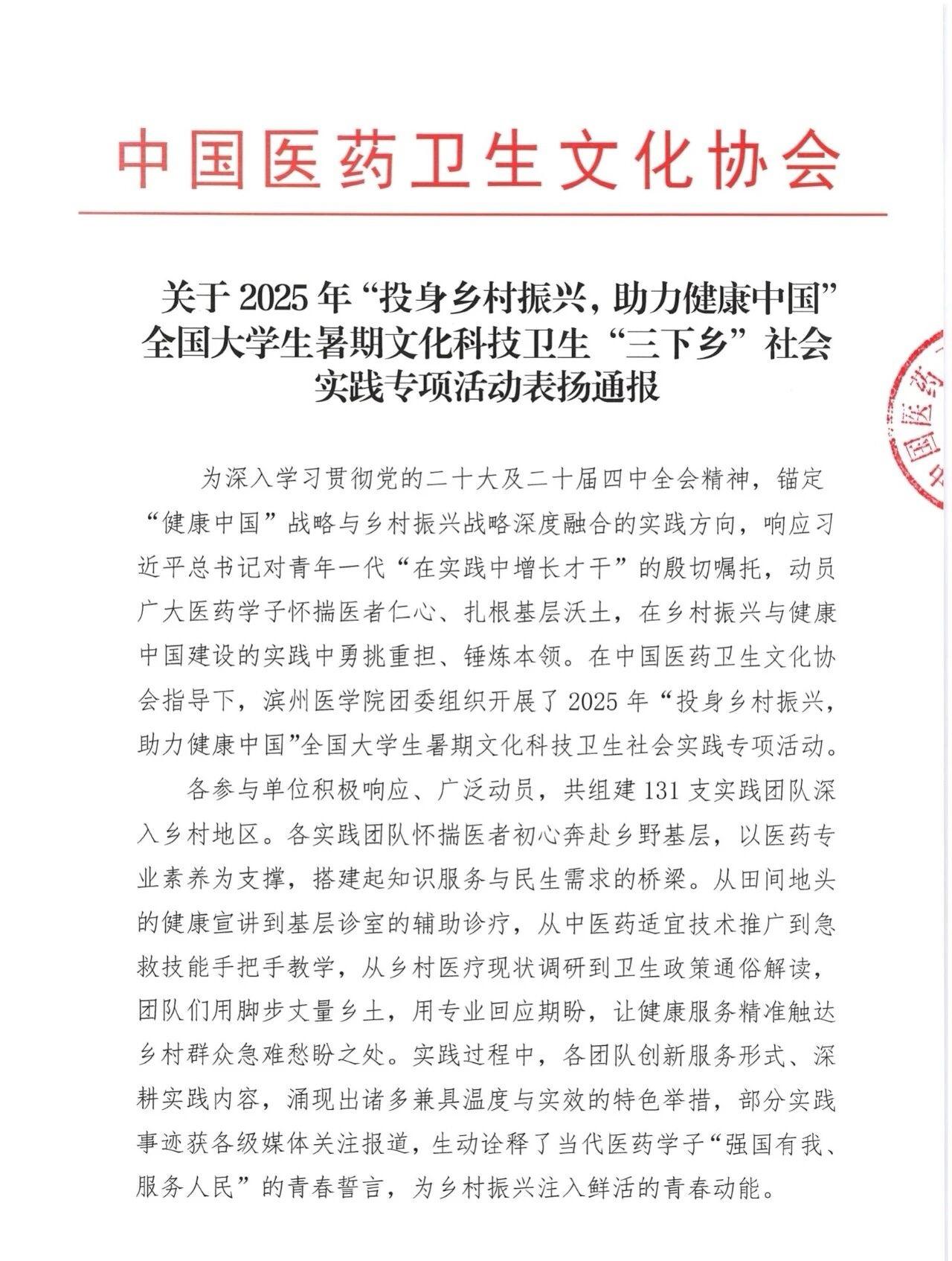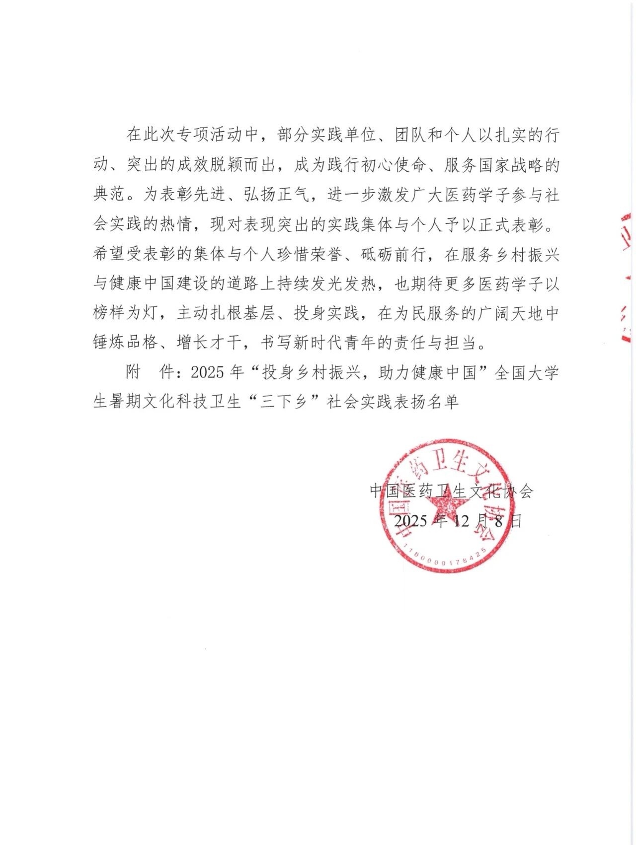 此前,成人影院 积极响应活动号召,在学院和校团委支持下精心筹备申报,获全国专项立项。在全国131支入围实践团队的激烈角逐中,成人影院 师生凭借优异表现脱颖而出、载誉而归。此次表彰,既是对成人影院 师生扎根乡村一线、以专业所长赋能健康乡村建设的高度认可,更是对成人影院 深化实践育人工作的有力鞭策。